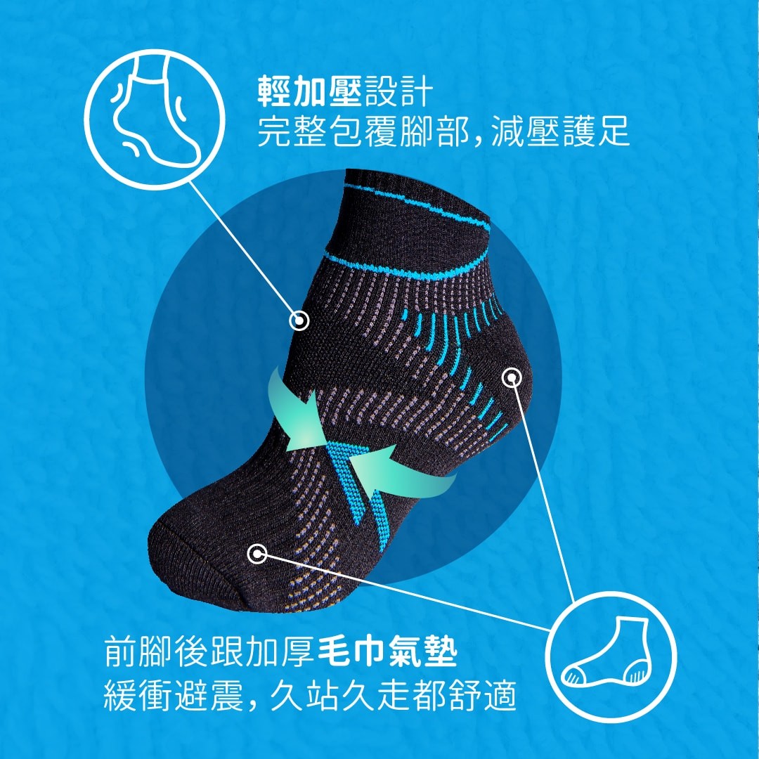 ● 前腳趾、後腳跟毛圈加厚包覆,緩衝避震,舒適減壓