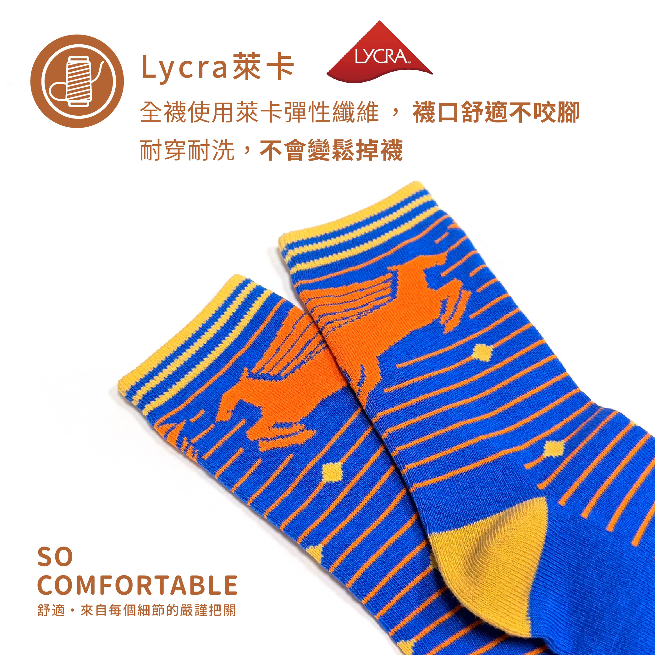 ● 全襪使用萊卡(LYCRA®)彈性纖維,延長襪子壽命,不易變鬆,耐穿不掉襪